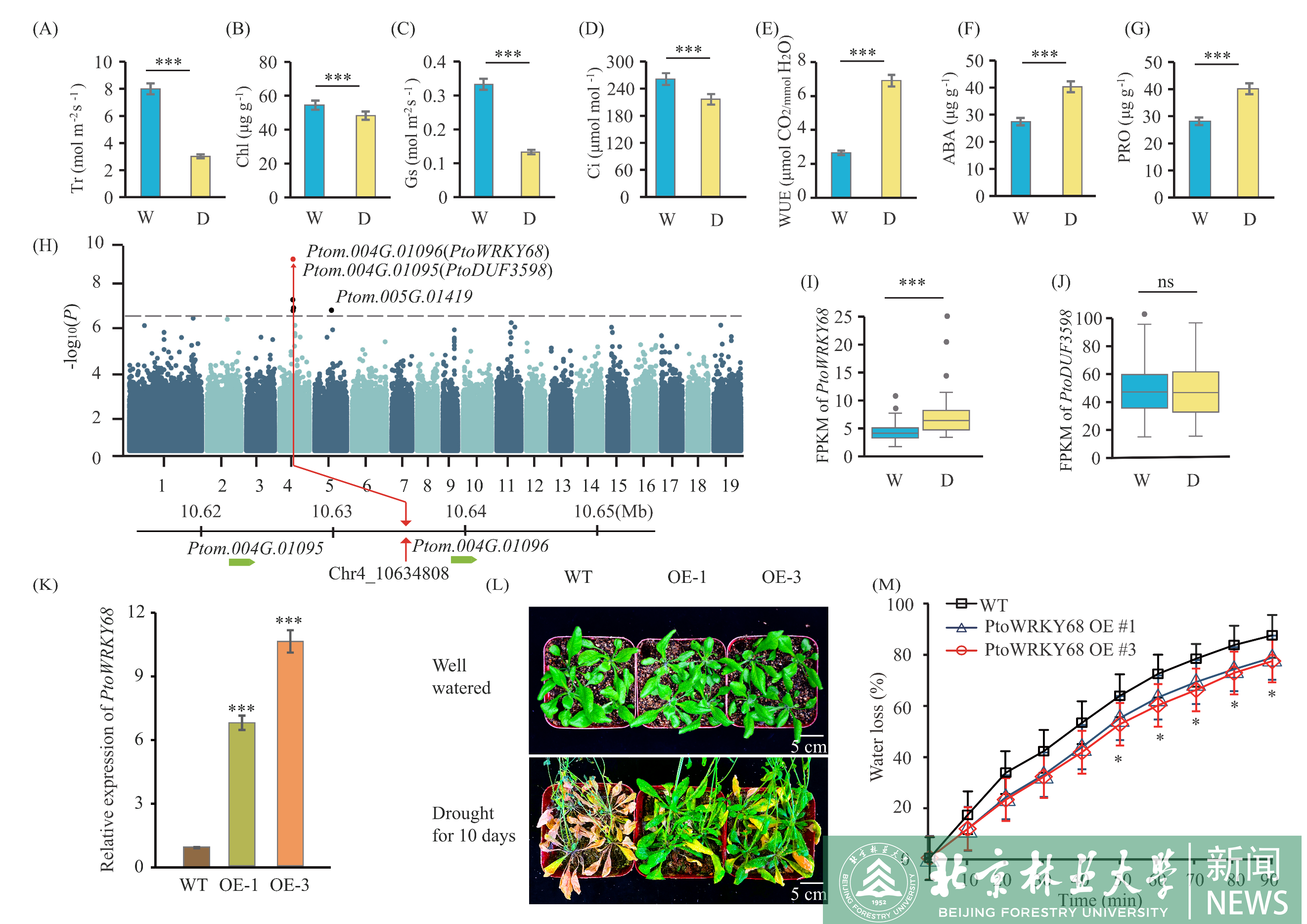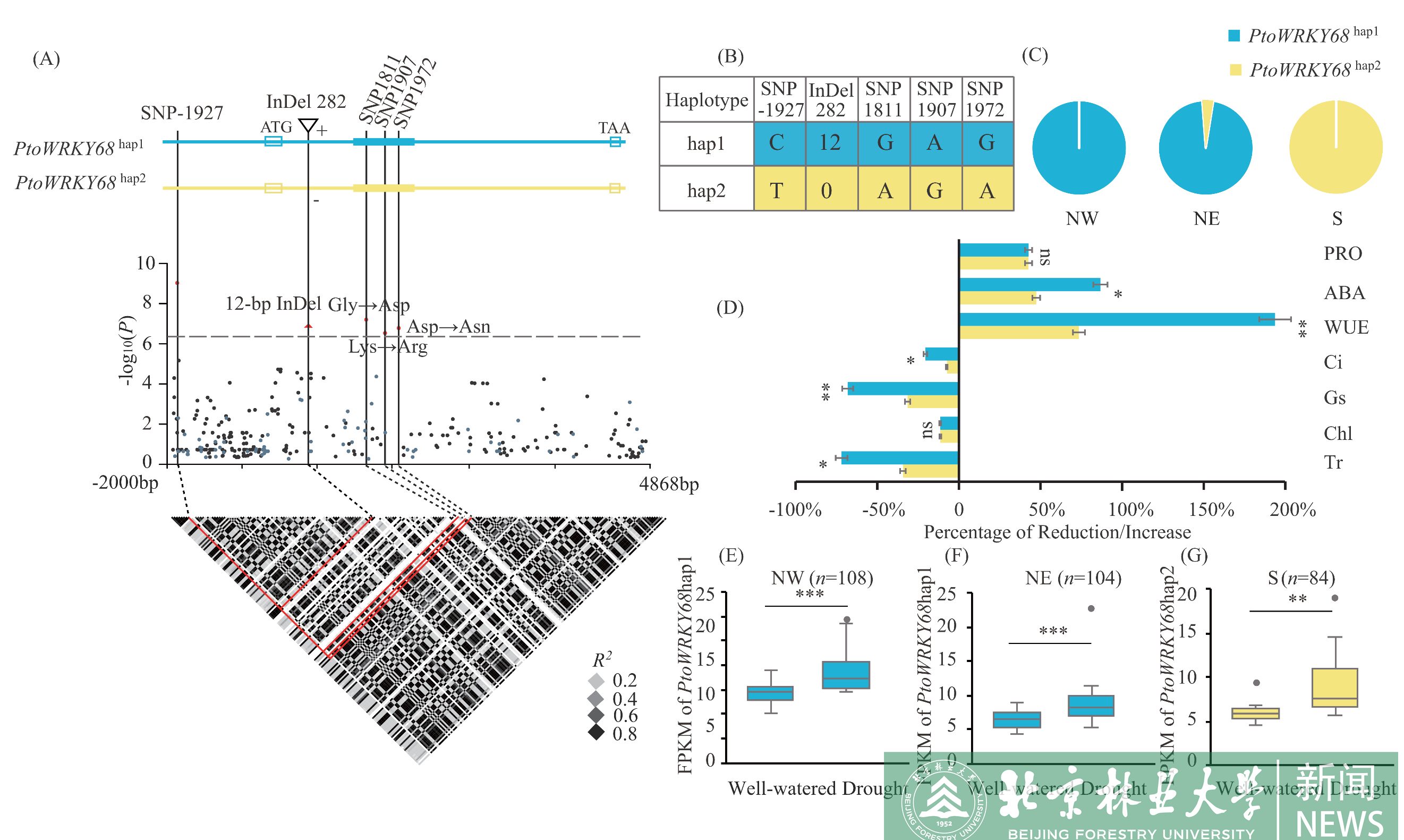 Recently, Zhang Deqiang's research group from the College of Biological Sciences and Technology, Beijing Forestry University, published a research paper entitled "Allelic variation in transcription factor PtoWRKY68 contributes to drought tolerance in Populus"  in Plant Physiology (Q1, IF=9.115).