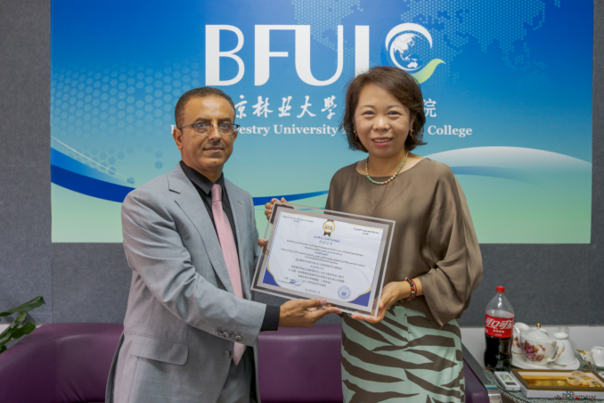 Recently, the Assistant Cultural Counselor of the Embassy of the Republic of Yemen in China Faris al-Muamari and his delegation visited Beijing Forestry University and sent a letter of thanks on behalf of the Embassy. He thanked Beijing Forestry University for providing a good learning and living environment for Yemeni international students, and thanked the faculties and staffs of the International College. He said that BFU is strongly recommended for interntaional students by the Embassy, and they strives to deepen exchanges between the two countries.
