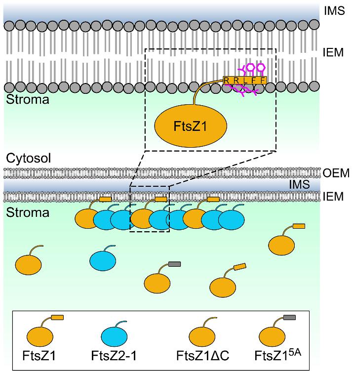 Working model of the structure and activity of the C-terminus of FtsZ1. The Z1C motif helps the FtsZ2/FtsZ1 copolymer bind to the chloroplast inner envelope.