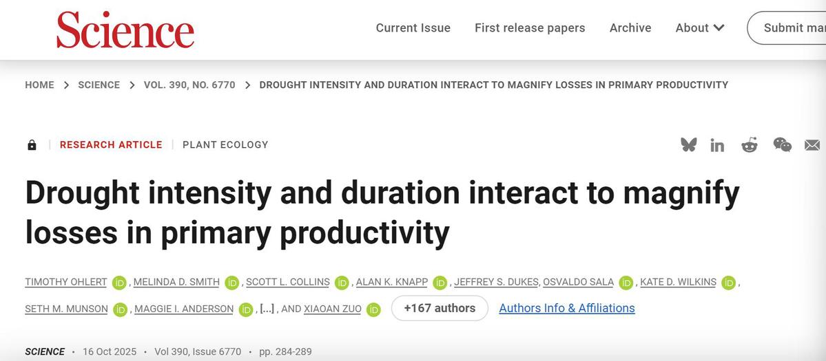 In a landmark study published in Science on Oct 17, titled "Drought intensity and duration interact to magnify losses in primary productivity", Professor Yu Qiang from Beijing Forestry University (BFU), alongside 177 researchers from 126 institutions across 28 countries, reveals the intensifying and prolonged drought threats on global ecosystems.