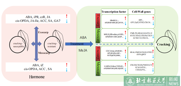 Lately, the research team led by Proffesor Li Yingyue from the College of Biological Sciences and Technology, Beijing Forestry University, published a paper entitled “HPLC-MS/MS-based and transcriptome analysis reveal the effects of ABA and MeJA on jujube ( Ziziphus jujuba Mill.) cracking” in Food Chemistry(Q1, IF=9.231).