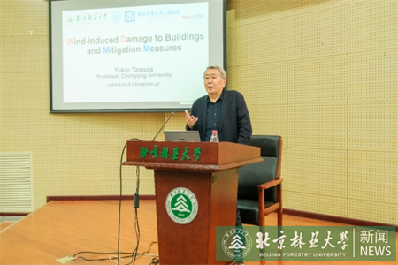 Recently, Jiufeng Green Forum at Beijing Forestry University was held in the lecture hall of the East Wing Building. Yukio Tamura, the foreign academician of the Chinese Academy of Engineering, the Japanese Academy of Engineering, the Indian Academy of Engineering, and the Academia European, was invited to give a research presentation entitled Wind-induced Damage to Buildings and Mitigation Measures at the forum. The dean of the School of Soil and Water Conservation presided over the meeting and more than 200 faculties and students attended the forum.
