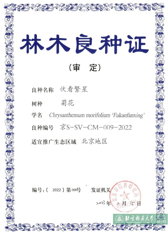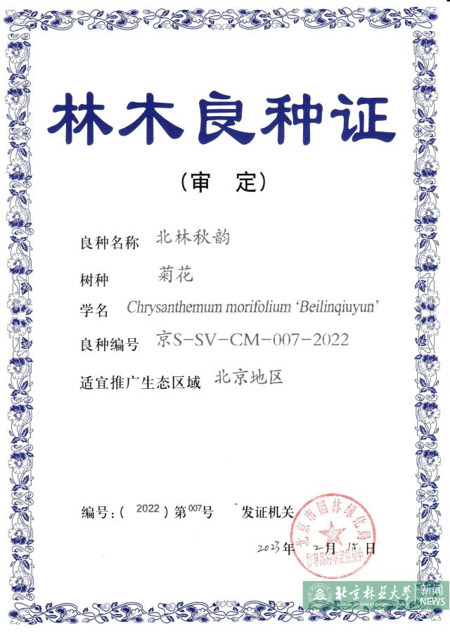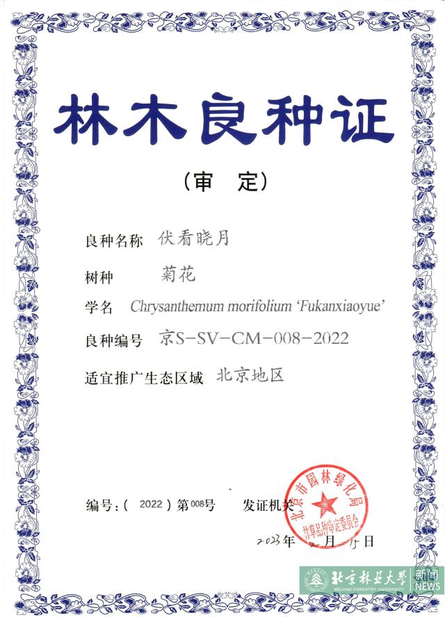 Recently, four new varieties of low creeping and plant-type compact chrysanthemum cultivated by the chrysanthemum breeding team of Professor Zhang Qixiang from the National Engineering Research Center for Floriculture of Beijing Forestry University obtained Certificate for improved varieties of forest tree in Beijng after the examination and approval of improved varieties in Beijing by official Committee.