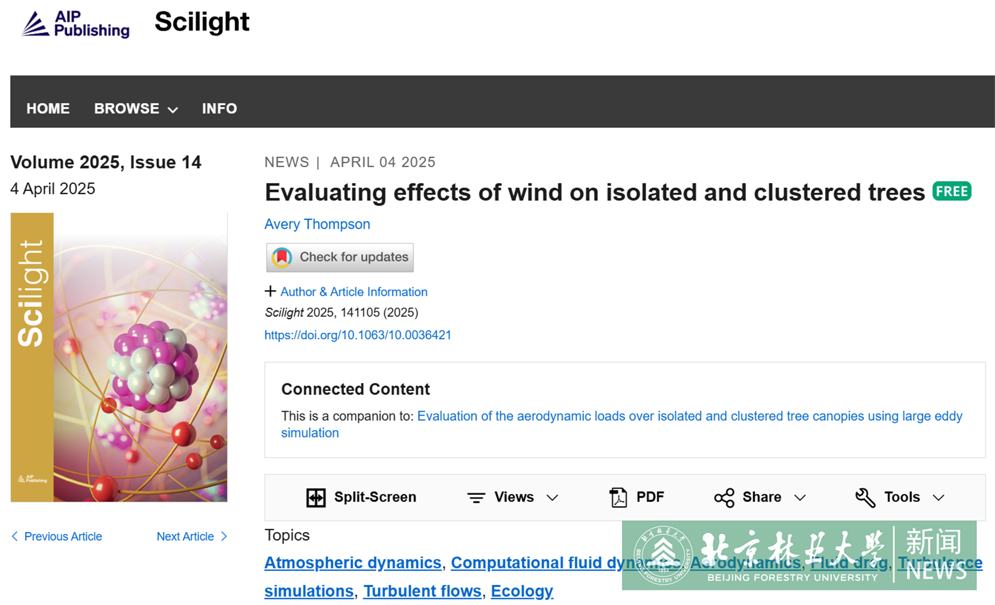 Research by Dr. Wang Jingxue from Beijing Forestry University's School of Soil and Water Conservation reveals how trees withstand strong winds, gaining international recognition. Published in the leading journal Physics of Fluids, the study, a collaboration with Italy's University of Bologna and China's State Grid research team, was featured on the journal's homepage and highlighted by AIP Scilight, a leading science news platform.