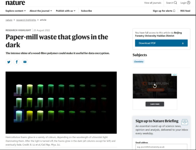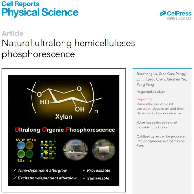 Recently, the latest research result “Natural ultralong hemicelluloses phosphorescence” Professor. Peng Feng and his team from College of Material Science and Technology of Beijing Forestry University was published in Cell Reports Physical Science , a premium open access journal from Cell Press, which aroused great concern in the field. in addition, the result was highlighted in the “research highlights” of the August 2022 issue of Nature in the title of “Paper-mill waste that glows in the dark”, and only 300-400 outstanding achievements will be selected into the “research highlights” of Nature every year.