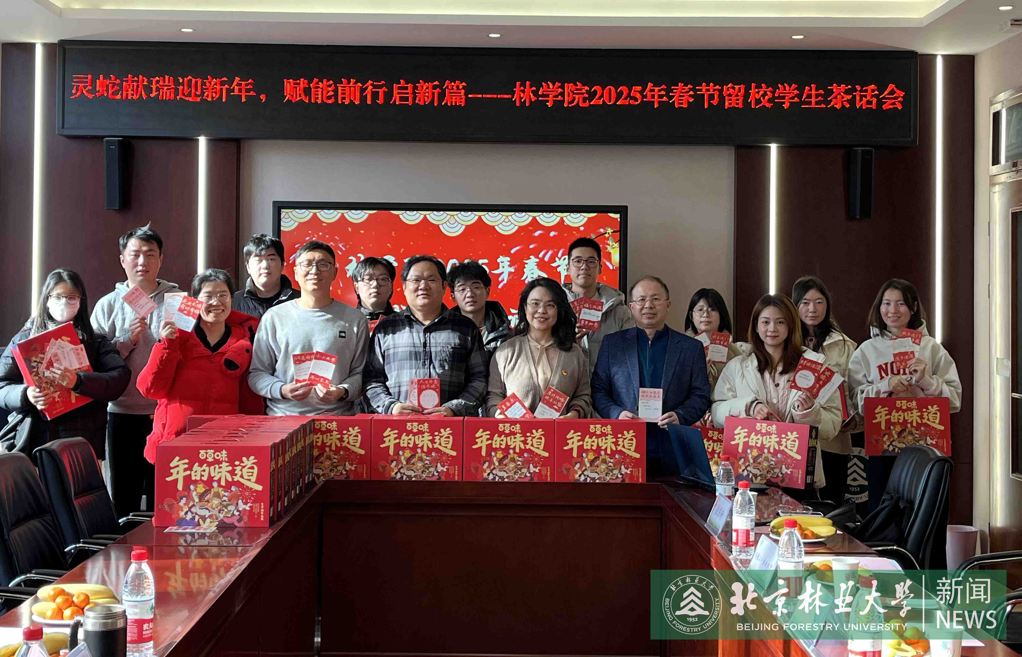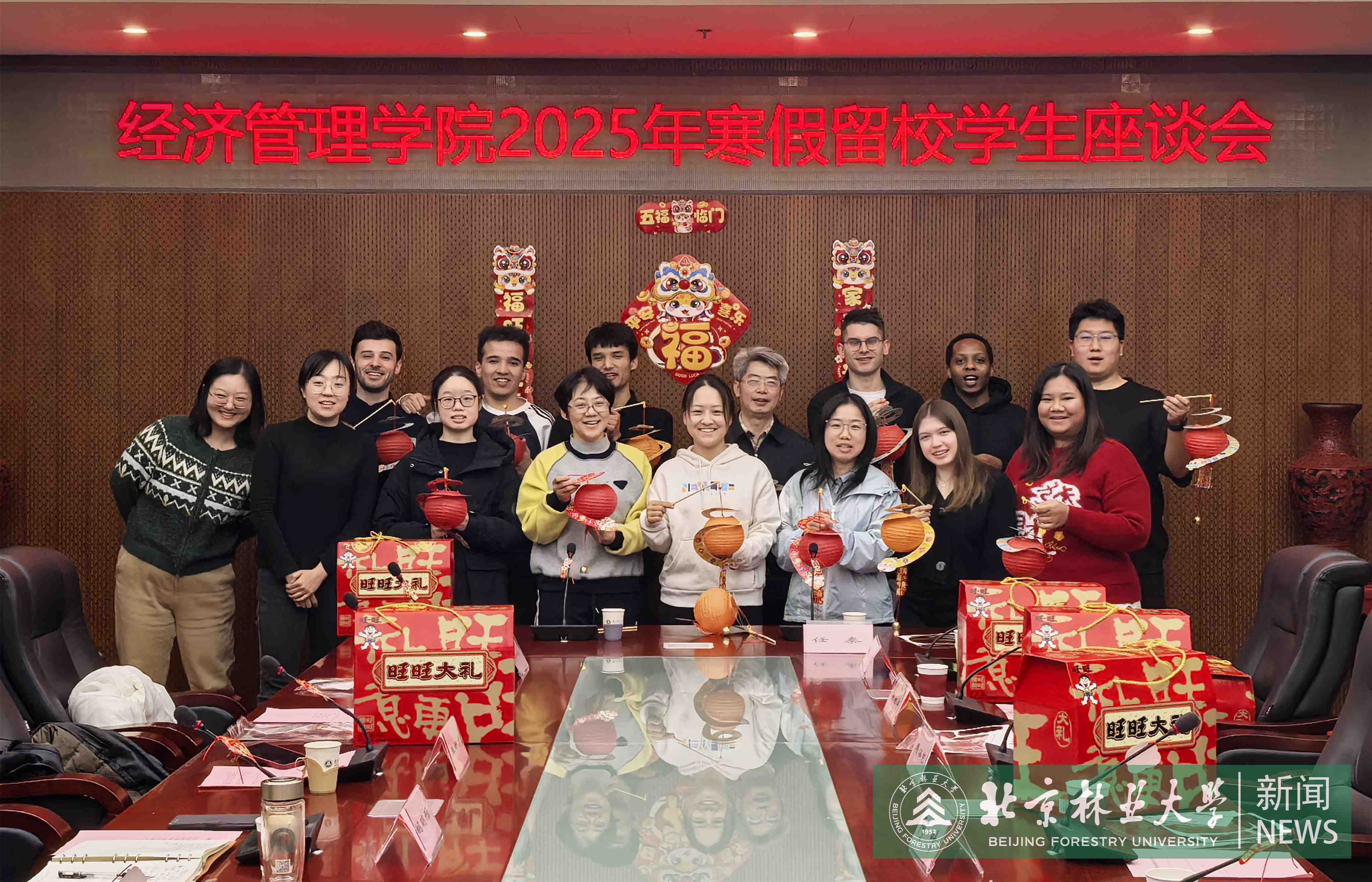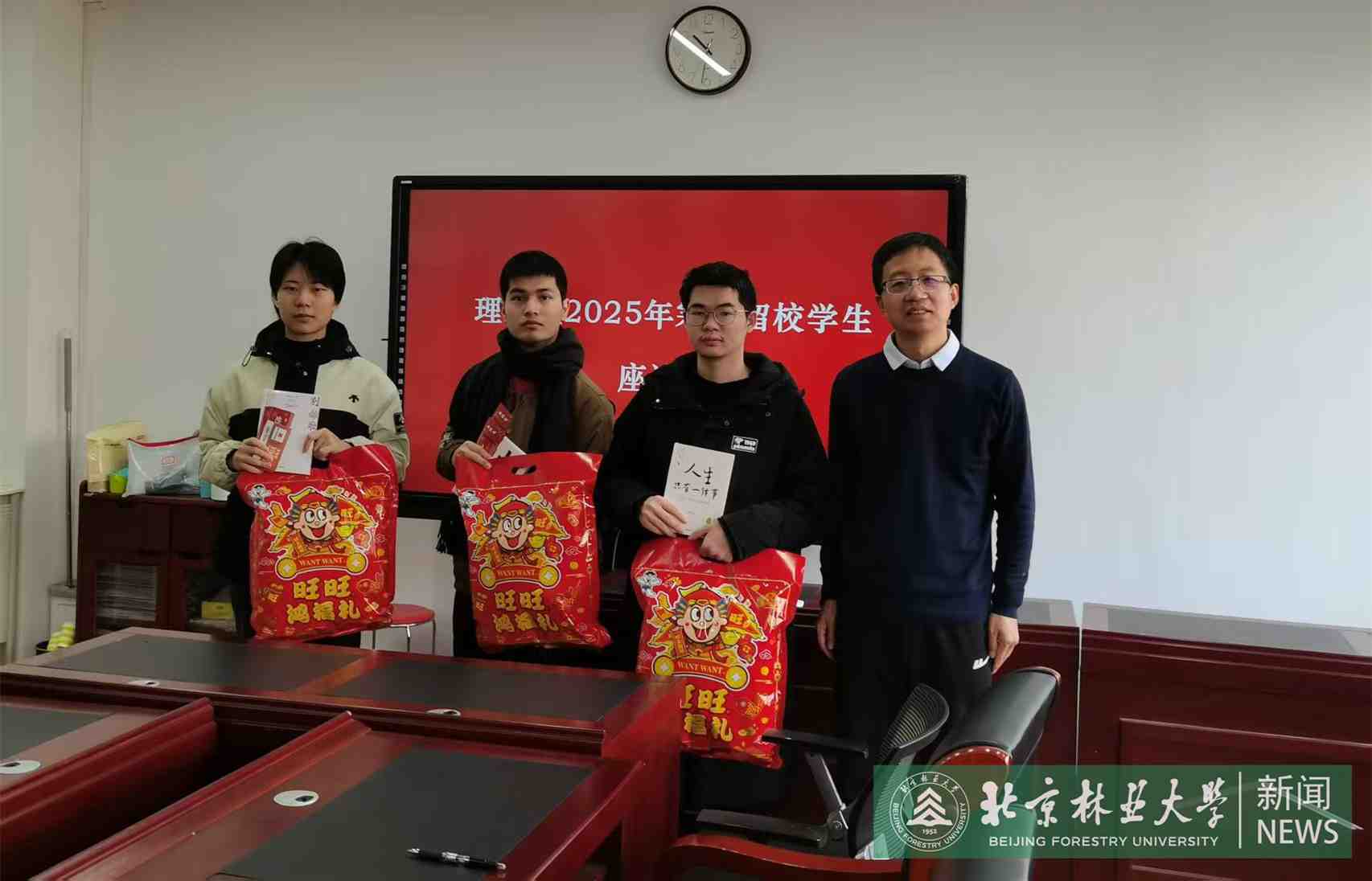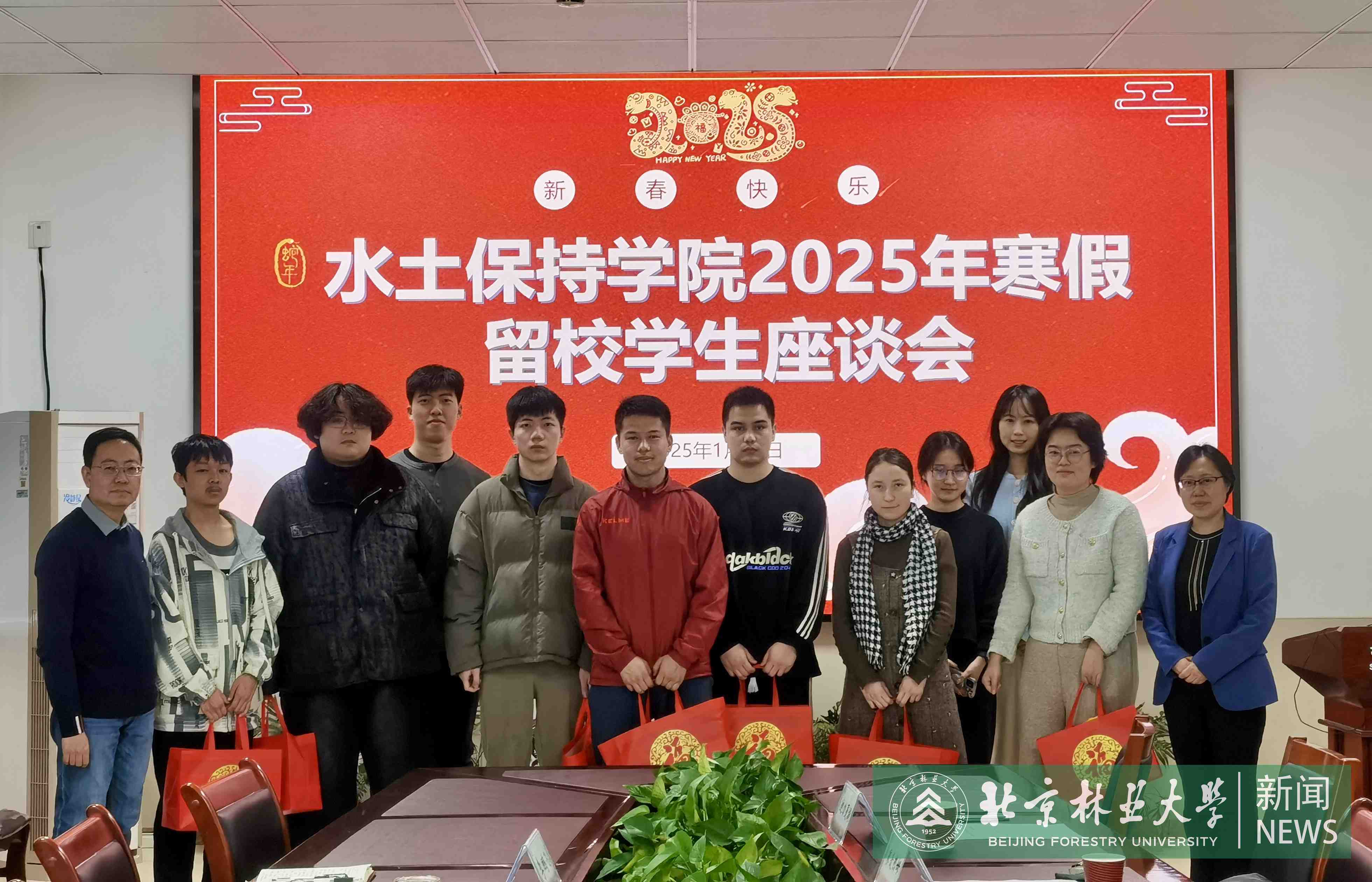As the New Year approached, Beijing Forestry University (BFU) arranged a get-together for students remaining on campus throughout the holiday duration.Vice President Li Xiong, along with representatives from the Student Affairs Office, Security Department, and academic schools, convened with students to exchange holiday greetings and discuss winter break arrangements.