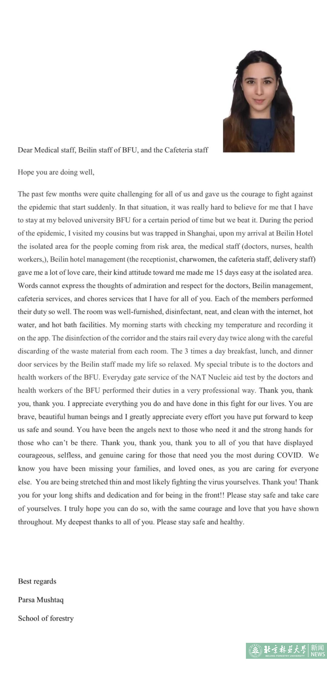 Recently, the General Support Department received a letter of thanks from Pakistan student Parsa who wanted to express her gratitude to the depratment and BFU for their thoughtful care and attetion during her isolation period due to the epidemic.