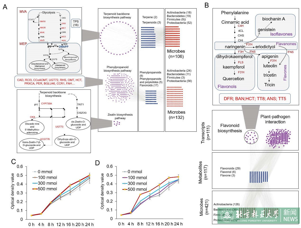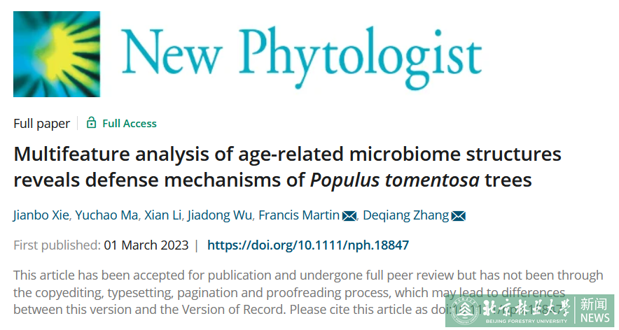 Recently, tree molecular breeding team from (Professor Zhang Deqiang/Professor Xie Jianbo; the College of Biological Sciences and Technology) and Francis Martin team from the University of Lorraine in France published their recent study entitled "Multifeature analysis of age-related microbiome structures reveals defense mechanisms of Populus tomentosa trees" in the top international journal "New Phytologist" (Q1, Impact factor:10.323). The study provides key information about long-lived species and their ecosystem impacts through the investigation of the defense strategy of perennials.