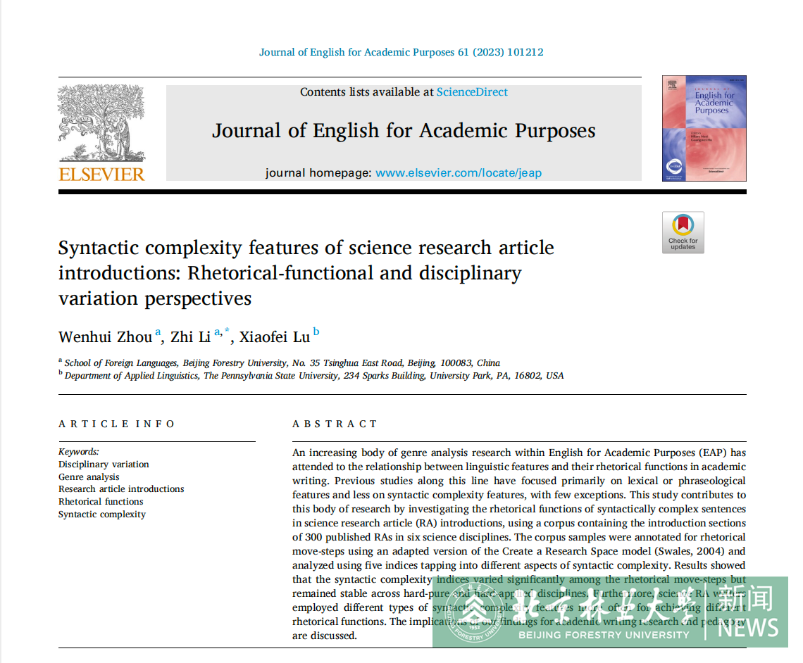 Recently, the latest research result of the School of Foreign Languages “Syntactic complexity features of science research article introductions: Rhetorical-functional and disciplinary variation perspectives” was published in the Journal of English for Academic Purposes (SSCI, linguistics category Q1, Impact factor: 2.811). The first author of this research article is Zhou Wenhui, a graduate student majored in Applied Linguistics from the School of Foreign Languages of BFU. The corresponding author is Professor Li Zhi, Dean of the School of Foreign Languages of BFU. The research article was co-supervised by Professor Lu Xiaofei from Pennsylvania State University.