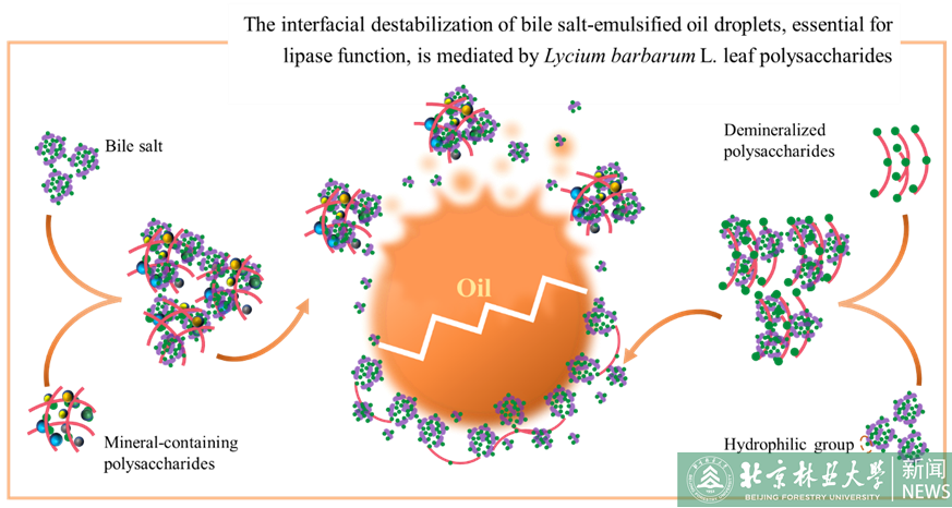 Recently, Professor Fan Junfeng and his team from The Department of Food Science and Technology of the College of Biological Sciences and Biotechnology published a paper entitled "The interfacial destabilization of bile salt-emulsified oil droplets, essential for lipase function, is mediated by Lycium barbarum L. leaf polysaccharides" in the top international journal “Food Hydrocolloids” (IF:11.504). The findings of the paper provided novel insights into the effects of plant-sourced polysaccharides on fat digestion from an interface chemistry perspective, and in particular, they deepened our understanding of polysaccharide interactions with intestine-secreted lipid digestants.