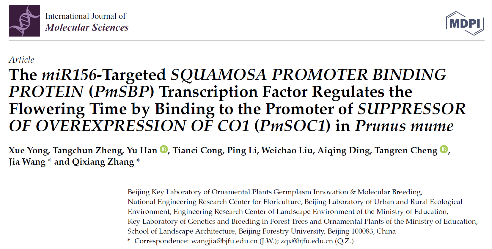 Recently, a paper titled "The miR156-targeted SQUAMOSA PROMOTER BINDING PROTEIN  (PmSBP ) transcription factor regulates the flowering time by binding to the promoter of SUPPRESSOR OF OVEREXPRESSION OF CO1  (PmSOC1 )   in Prunus mume " written by the research team led by Professor Zhang Qixiang of School of Landscape Architecture was published online in International Journal of Molecular Sciences(IF="6.208).