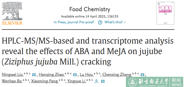 Lately, the research team led by Proffesor Li Yingyue from the College of Biological Sciences and Technology, Beijing Forestry University, published a paper entitled “HPLC-MS/MS-based and transcriptome analysis reveal the effects of ABA and MeJA on jujube ( Ziziphus jujuba Mill.) cracking” in Food Chemistry(Q1, IF=9.231).